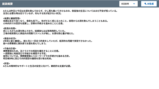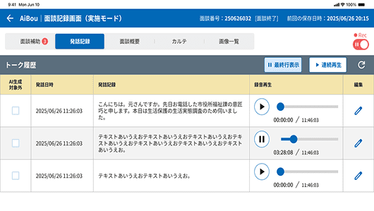 タブレットで取得した音声をAIが自動でテキスト化するので、メモを取る必要がなくなり、対話に集中することができます。後から録音を聞き直す、誤字脱字を加筆/修正することも可能です。