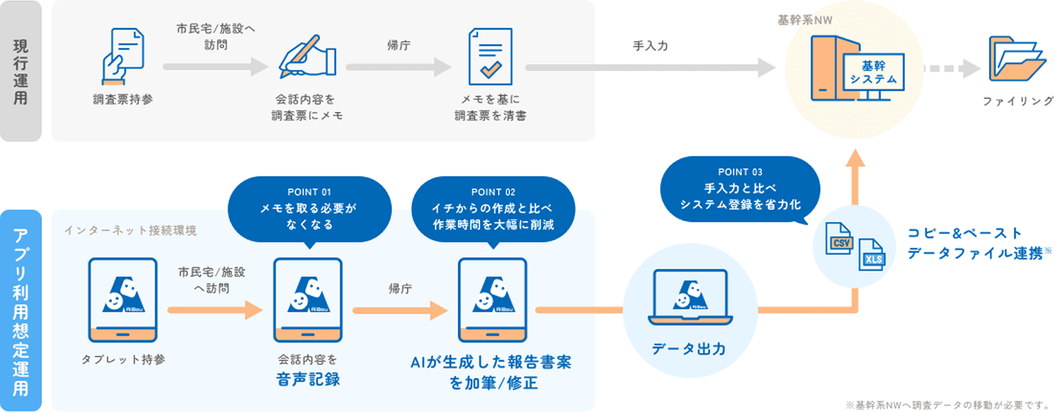 - 該当の紙の調査票を探したり、基幹系システムから出力して持っていく手間が省けます。