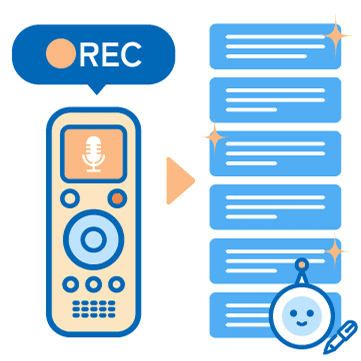 ボイスレコーダーなどから音声データを取込んで自動メモ、報告書作成が可能です。アプリが使えない面談も安心して臨むことができます。
